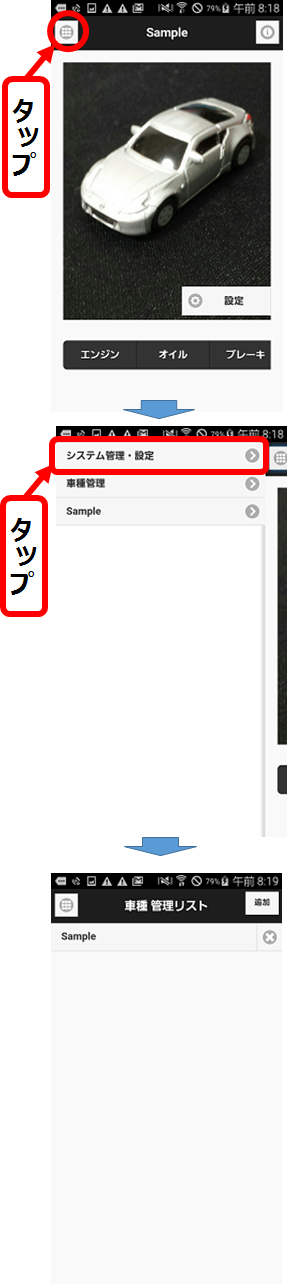 - 「車種管理リスト」画面で、車種の右端部分×ボタンをタップ。