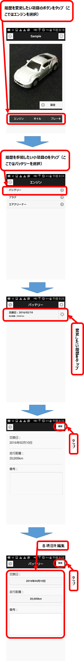 - 車をメンテナンスして、パーツの交換を行ったときは、履歴として登録しましょう。