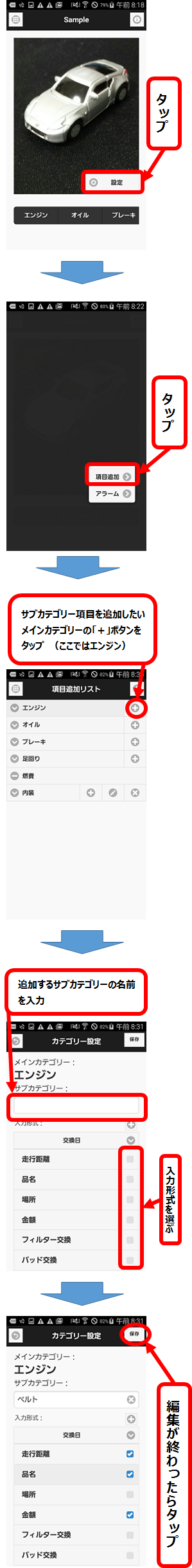 TOP画面から、履歴入力画面の表示・操作、各項目の設定、