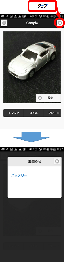 TOP画面右上の「お知らせ」ボタンをタップすると、