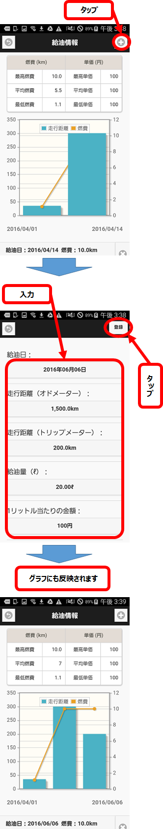 また燃費画面の各操作を以下で説明します。
