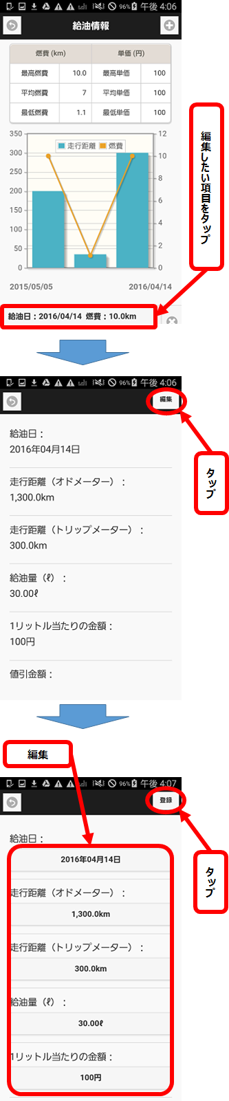 - 各給油情報の詳細を参照したい場合は、その項目をタップします。