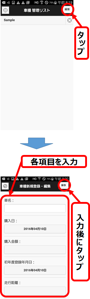 # 「車種管理リスト」画面で右上の「追加」ボタンをタップ。