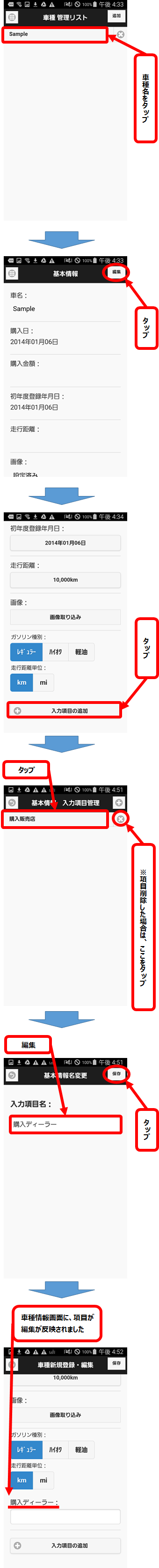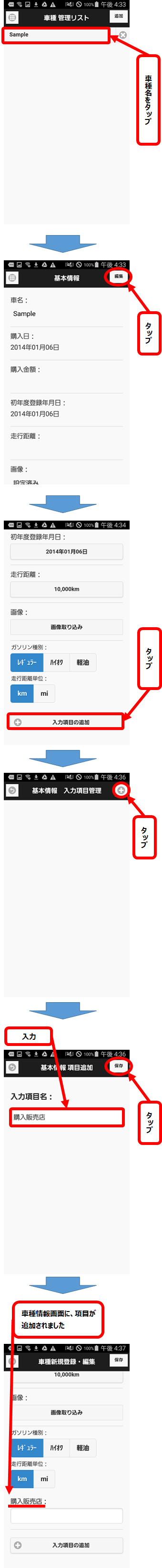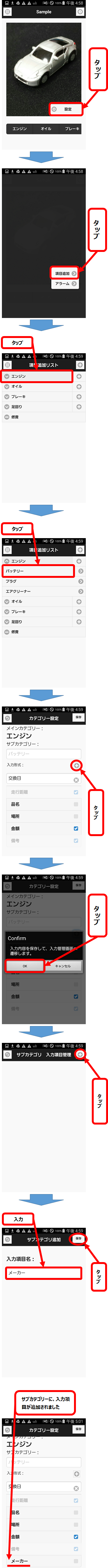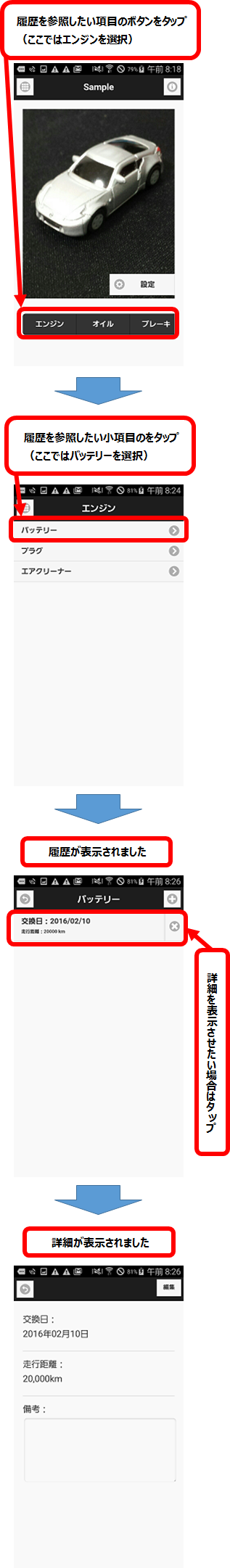 TOP画面から、履歴入力画面の表示・操作、各項目の設定、