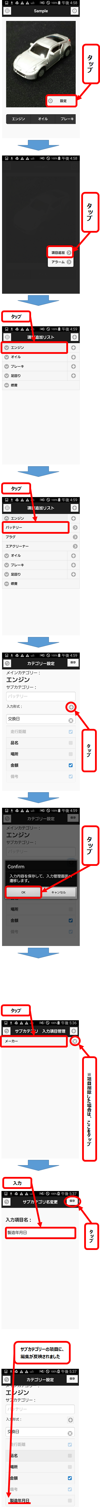 - 追加済みの項目が一覧で表示されます。編集を行いたい場合は項目名をタップし、削除したい場合は右の「×」ボタンをタップします。