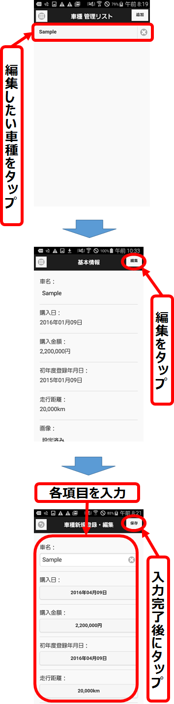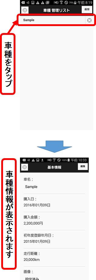 - 「車種管理リスト」画面で、車種の名前をタップ。