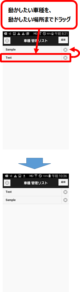 - 「車種管理リスト」画面で、並び替えをしたい車種を、移動させたい場所までドラッグ&ドロップで移動。
