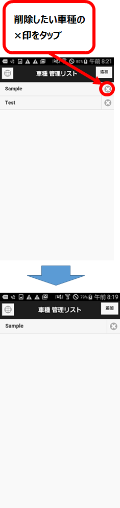 - 「車種管理リスト」画面で、車種の右端部分×ボタンをタップ。