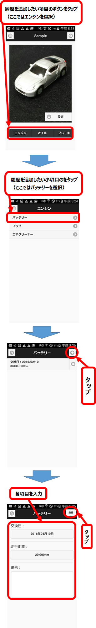 - 車をメンテナンスして、パーツの交換を行ったときは、履歴として登録しましょう。
